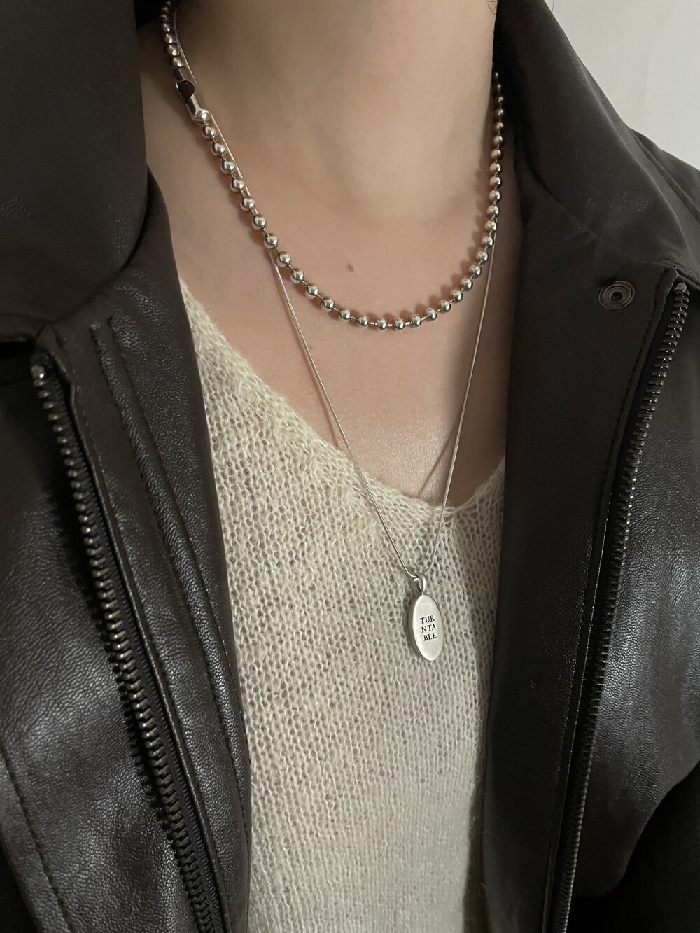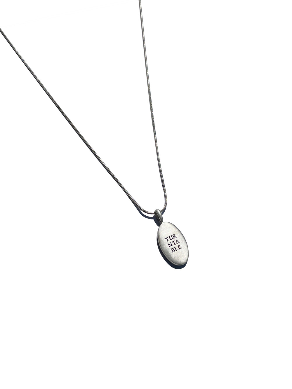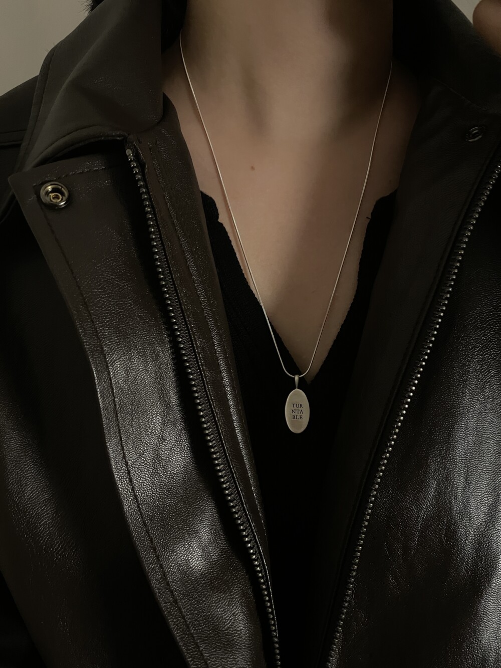 턴테이블의 로고가 각인된 타원형 무광 팬던트 목걸이입니다. 여유로운 기장감의 뱀줄 체인으로 제작되어 다른 목걸이와 레이어드해 착용하거나, 심플한 룩 위에 단품으로 착용해 모던한 느낌을 연출할 수 있습니다.